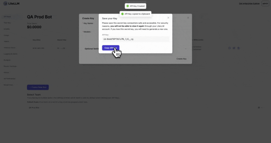 Create a key for Team=QA Prod Bot and team_id="de35b29e-6ca8-4f47-b804-2b79d07aa99a" from Step 1
